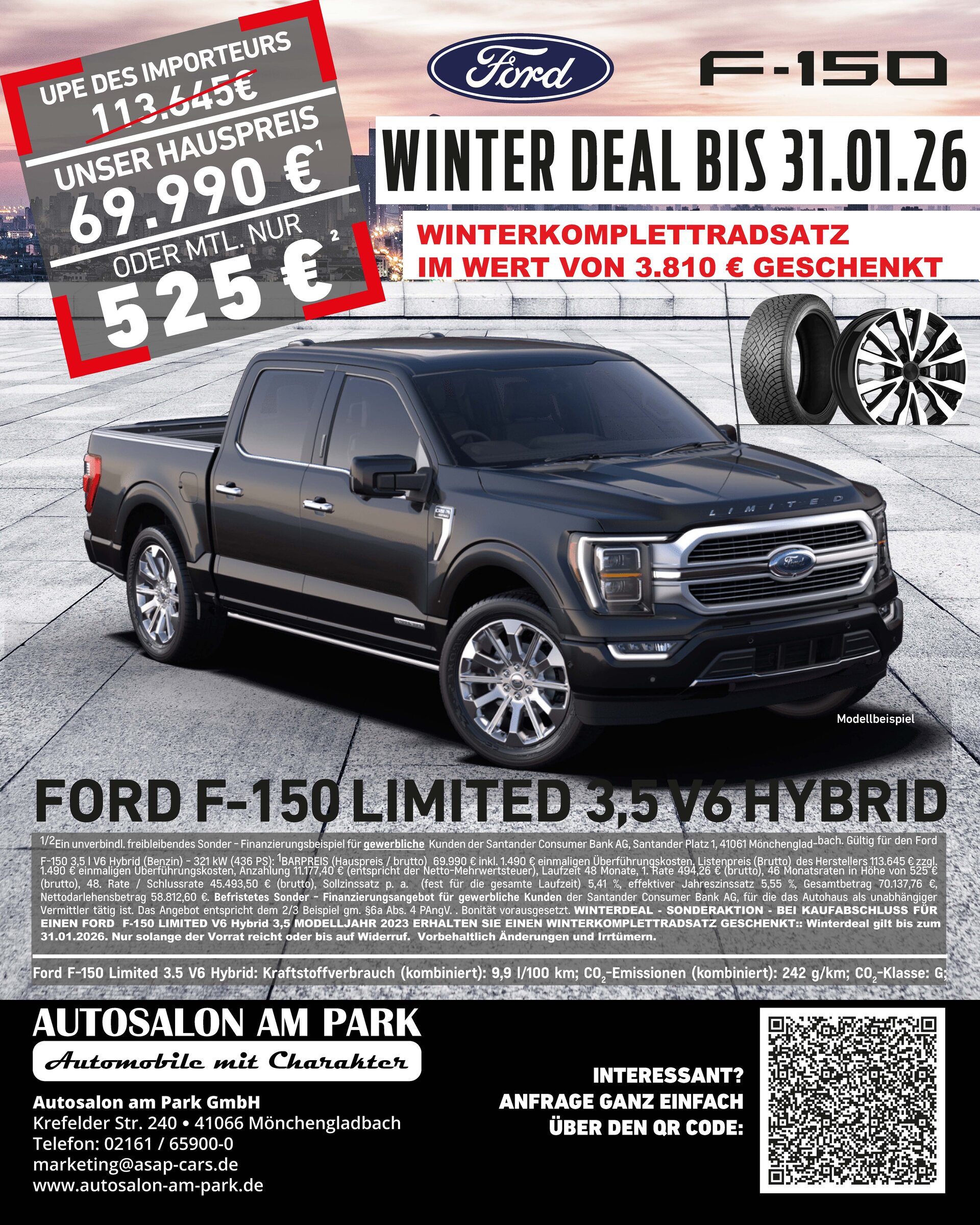 Ford F-150 Limited3,5 V6 Full Hybrid / 320 kW (435 PS): Kraftstoffverbrauch (komb.): 9,9 l/100km; CO2-Emissionen (komb.): 242 g/km; CO2-Klasse: G