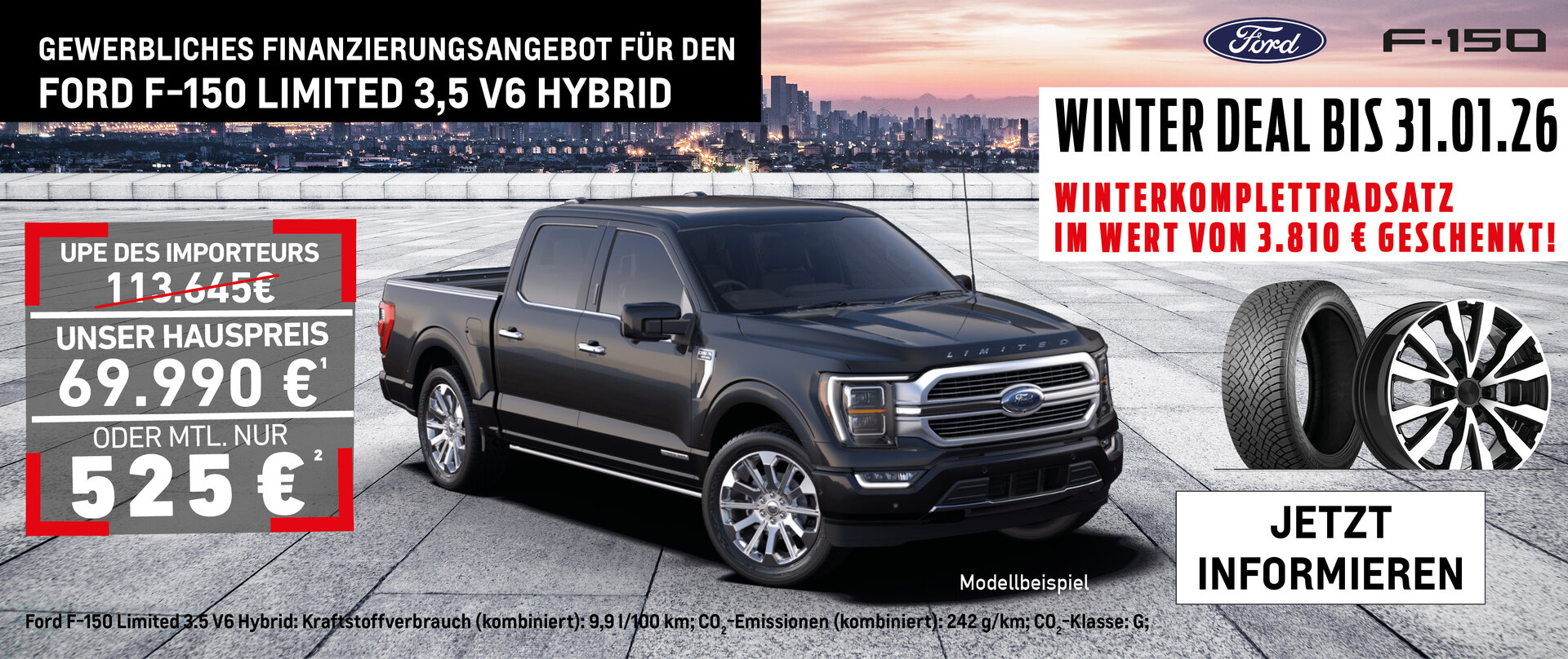 Ford F-150 Limited3,5 V6 Full Hybrid / 320 kW (435 PS): Kraftstoffverbrauch (komb.): 9,9 l/100km; CO2-Emissionen (komb.): 242 g/km; CO2-Klasse: G